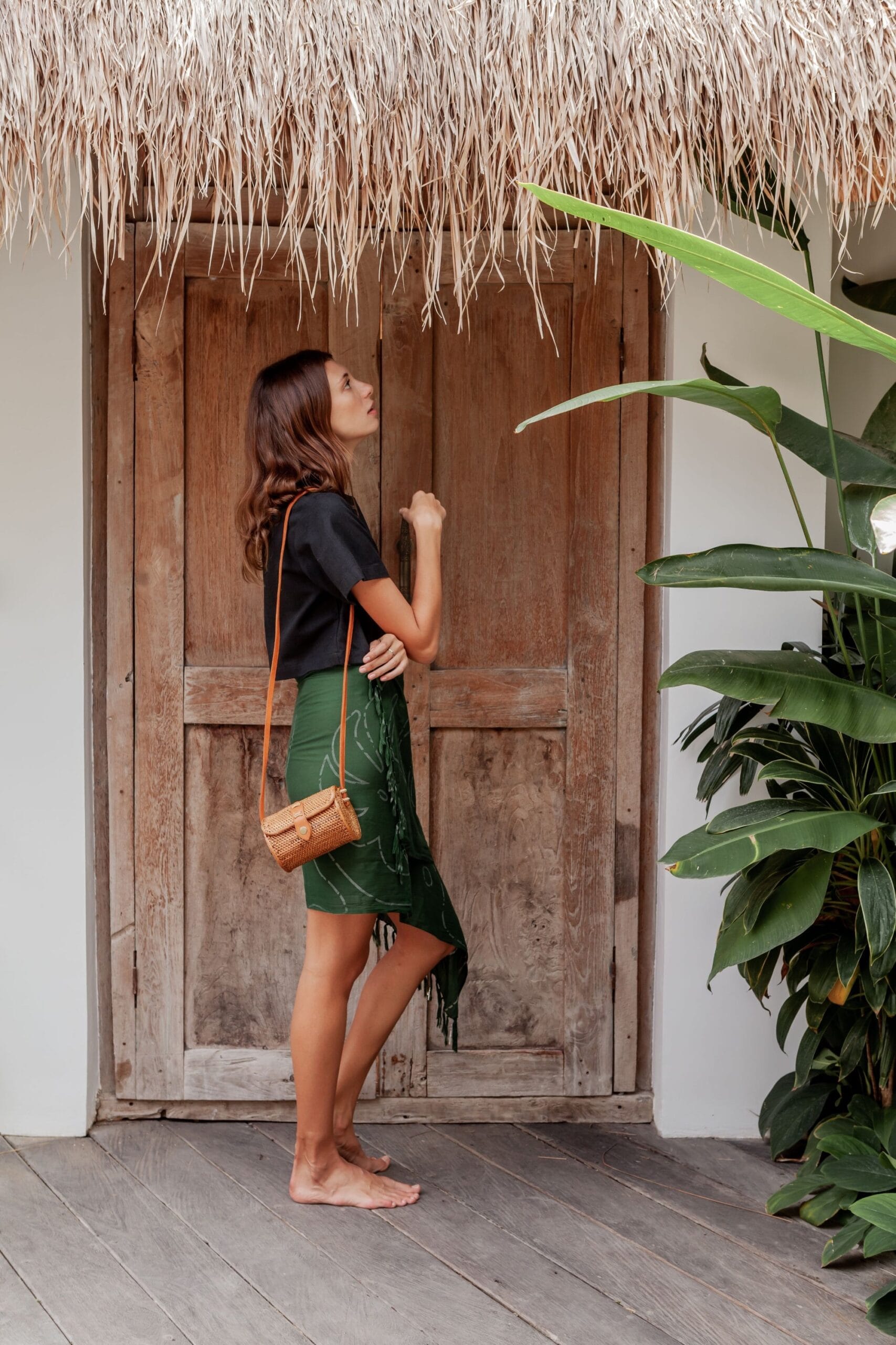 Dress it up or dress it down. This natural rattan purse may just be your new favorite accessory. Handmade in Bali, features include: circle body shape, leather strap with metal snap closure, and lined with traditional batik fabric.